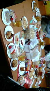 誠さんの手作りケーキ、ケンタとみんなで持ち寄ったお菓子で机の上がいっぱいに。